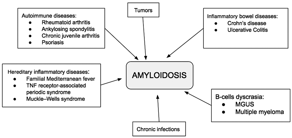 Infections and inflammation cause the liver to produce a protein called SAA. Its a slow progressing disease and it can take years before any symptoms show. These proteins can clump together and form amyloid deposits.